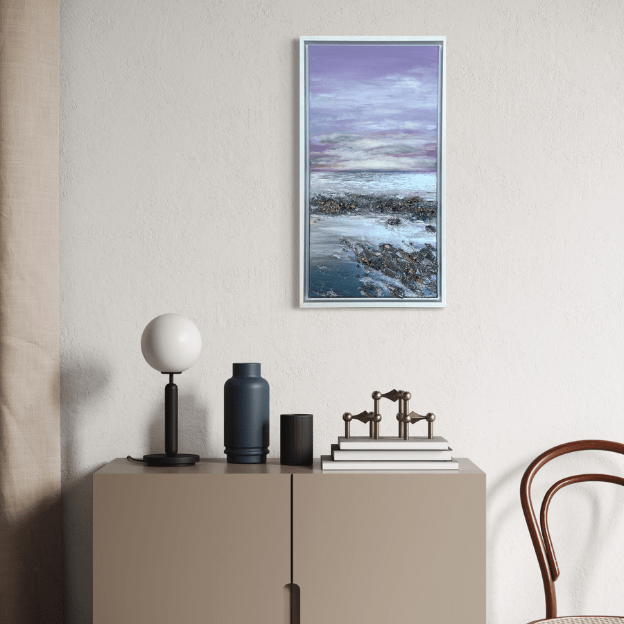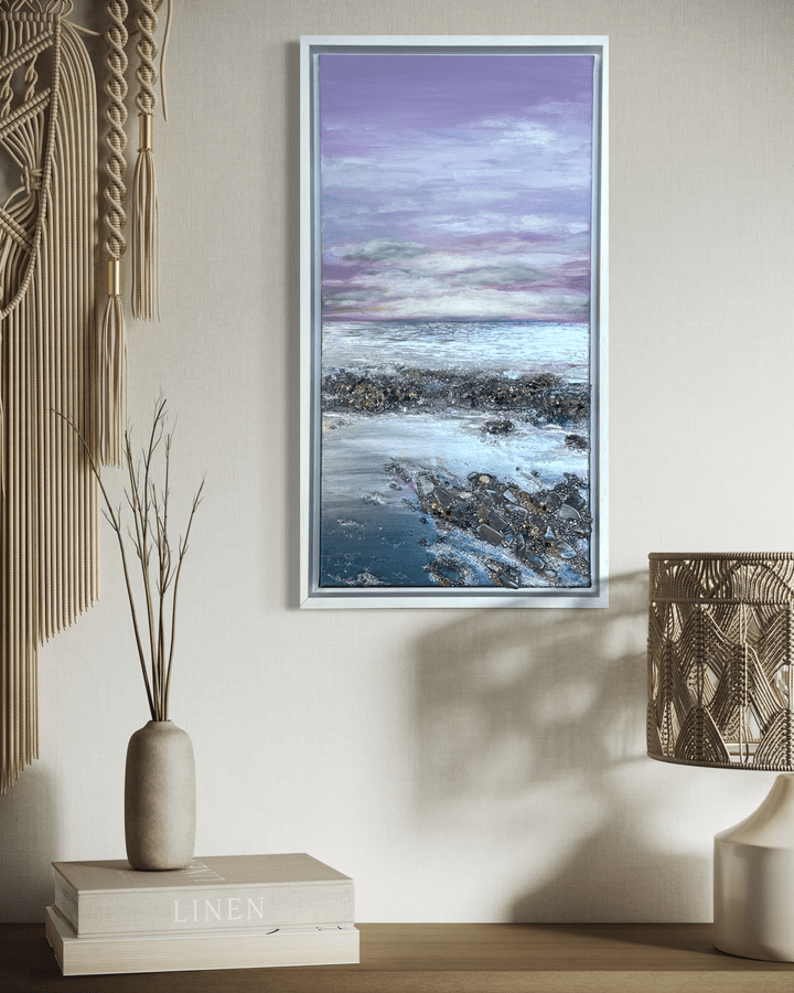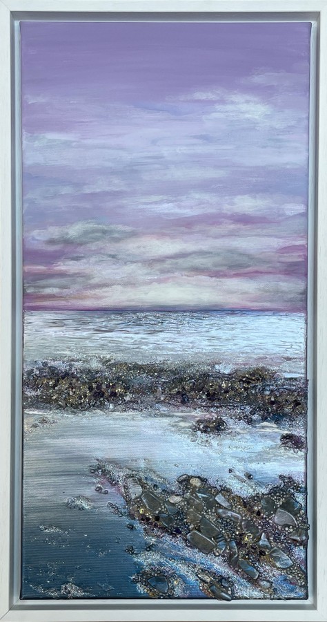 Soft violet tones stretch across the horizon, capturing the quiet magic of dusk as sky and sea dissolve into one another. In the foreground, textured rockpools shimmer with embedded amethyst and rose quartz, their surfaces catching the light like hidden constellations along the shore.