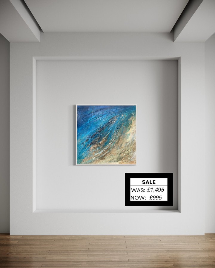 "Littoral Echo" beckons you to delve into the essence of the sea, merging aerial views, underwater sea swimming, and the shoreline. The abstract arrangement manipulates perspectives - observing from above, submerged within the depths, or tracing the sea's edge? The harmonious blend of blues, greens, and textures encapsulates the dynamic coastal encounter, enabling each observer to undertake a personal journey of interpretation and reflection. Much like the ocean itself, the painting reveals more intricate details upon closer inspection, inviting a deeper connection with its fluid narrative.