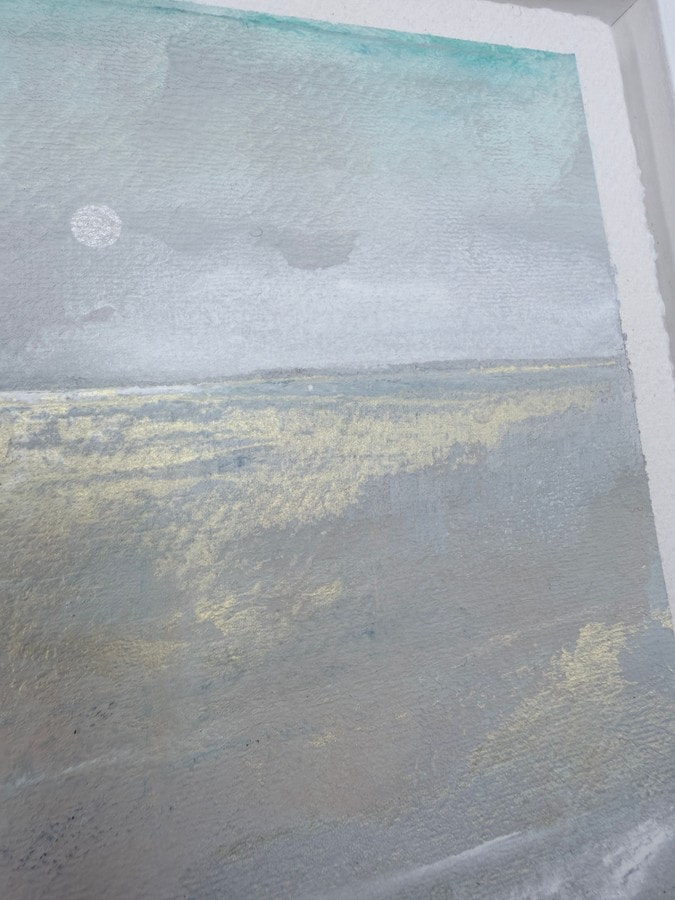 A soft, atmospheric seascape under a pale moon, where silvery tones and gentle washes of colour create a quiet, reflective mood. The horizon feels distant and calm, with light subtly shifting across the surface.