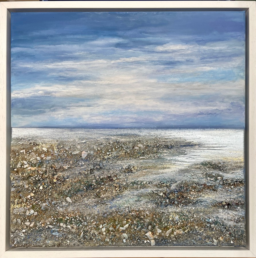 A contemplative seascape alive with texture and subtle shimmer. Embedded crystals and found materials echo the quiet pause of the shoreline, where land and sea meet in balance.