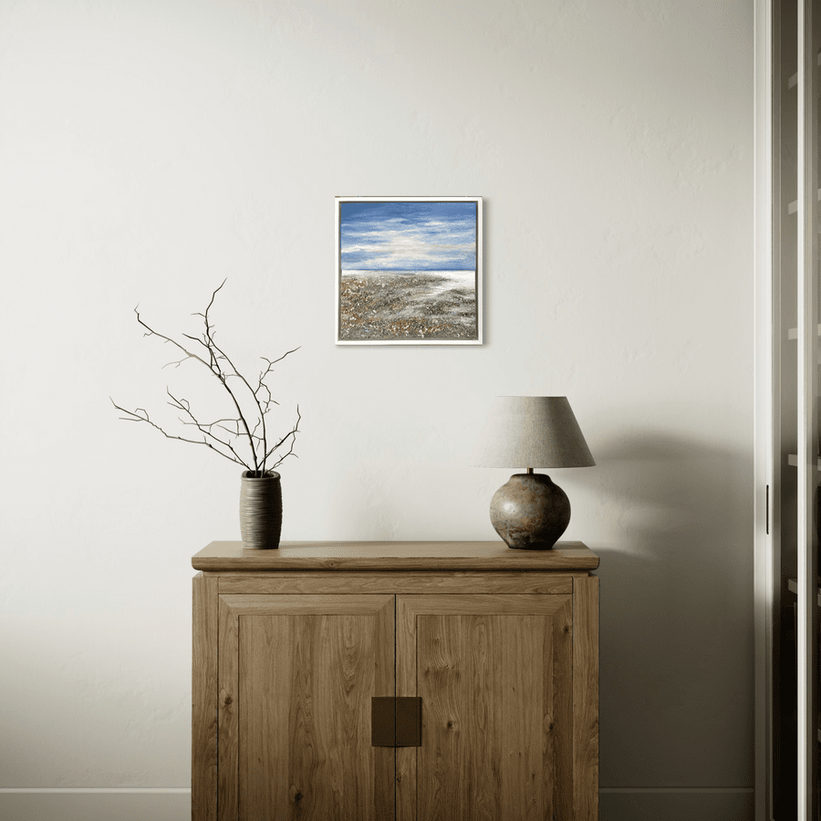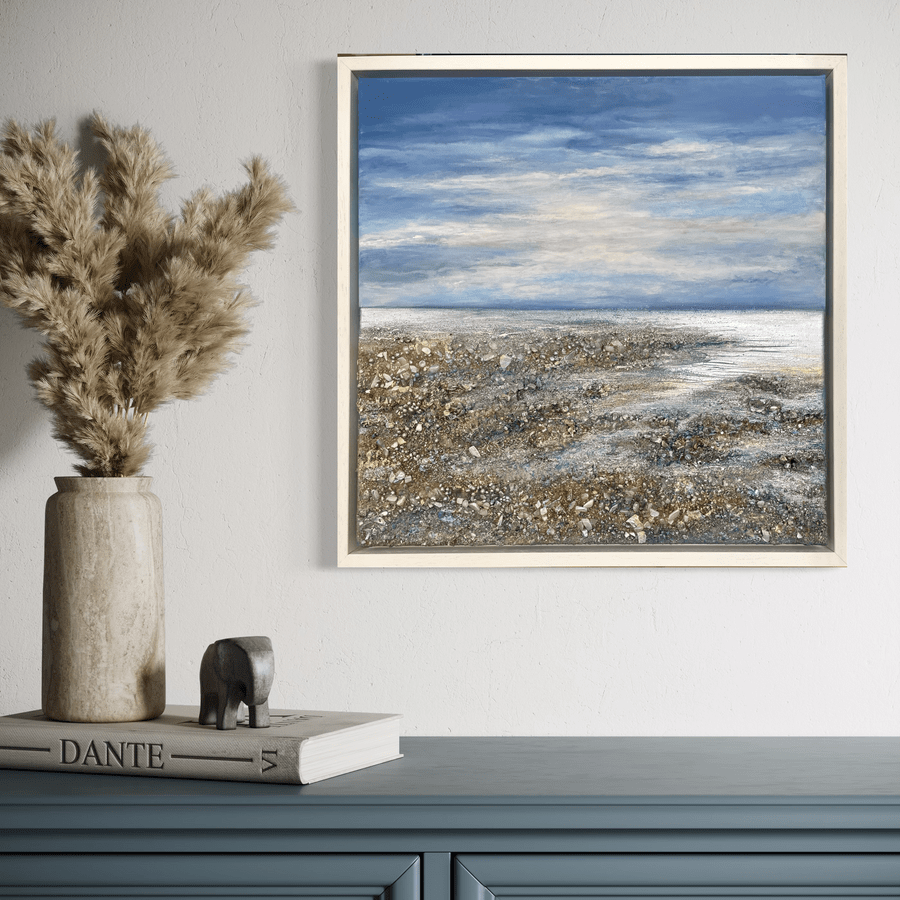 A contemplative seascape alive with texture and subtle shimmer. Embedded crystals and found materials echo the quiet pause of the shoreline, where land and sea meet in balance.